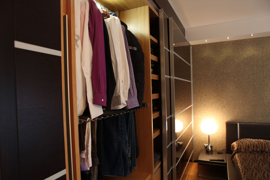 Realizzazione parete a giorno con ante complanari laccato lucido corda, porte in zebrano con stipiti in wengé, cabina armadio. In collaborazione con Arch. Vincenzo Loglisci.